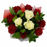Классический букет из красных роз, по середине белые с добавлением рускуса (зелени) и в упаковке. Букет представлен в трех вариантах: классический (11 роз), стандарт (15 шт.) и VIP (19 шт.).